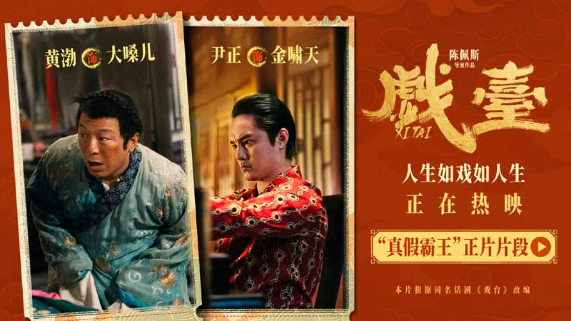 在此次发布的正片片段里,黄渤饰演的店伙计大嗓儿扮完妆正准备上台时,与名角儿金啸天(尹正饰)在后台意外相遇,俩人如同照镜子般看着对方。另一边戏班班主侯喜亭正要招呼大嗓儿上台救场,却发现眼前的场面似乎有些麻烦,戏院吴经理和戏班众人看着也慌了神。见大嗓儿与金啸天对峙,侯班主上前打圆场,教化处处长徐明礼回过神来,下令必须让送包子的上台。为求自保,侯班主只好让两人唱戏词辨真假。果不其然大嗓儿又把京剧唱成了唐山落子,班主崩溃之余把“假霸王”推上了台;而“真霸王”金啸天,则被徐明礼打晕过去。一纸错认,两副“霸王”妆,在现实与生存的漩涡中,一场啼笑皆非的大戏已然上演。命运开了个错位玩笑,却照见了现实之下艺术的脆弱与个体的渺小。这段“真假霸王”后台相遇的片段,堪称电影《戏台》荒诞喜剧风格的精妙缩影。