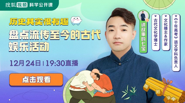 现在流行的娱乐行为或是居家好物,其实早在古代时期就已经在大规模使用了,而随着时代的演变才慢慢变成了现在我们日常生活中的样子,那么究竟都有哪些行为或物品呢?为了探索历史上的文化生活和行为是如何演变至今的,搜狐视频将上线全新“历史其实很有趣”主题科学公开课,在12月20日至12月25日一周内,邀请6位科学播主进行6场直播。