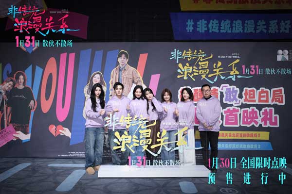 电影《非传统浪漫关系》由中影创意(苏州)电影有限公司、江苏省电影集团有限公司、昆山市周庄双桥电影制片有限公司、阿那亚影业(北京)有限公司、北京小漾影业有限公司、中影创意(北京)电影有限公司、江苏苏影橙风影业有限责任公司出品,传影周庄(江苏)影视文化有限公司、三亚金椰海影有限责任公司联合出品,中国电影产业集团股份有限公司、天津猫眼文化传媒有限公司发行。影片浪漫预售中,将于1月30日全国限时点映,1月31日正式上映,走进影院,在欢笑中开启这场关于“爱与自由”的新年必修课。