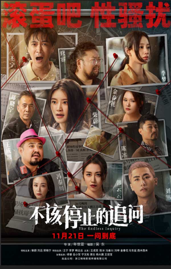 由年世亚导演,吴东编剧,柴蔚、刘迅、郑晓宁领衔主演,王宁、李梦特别出演的反性骚扰电影《不该停止的追问》自宣布定档11月21日以来,就引发了诸多好评——“影片真敢拍”、“反性骚扰的电影现实意义重大”、“三观极正,值得期待”等不绝于耳,引发网友热议。近日,影片又发布了“全员入局”版海报, 11个角色悉数登场,充满疑云的性骚扰恶行背后,真相更加扑朔迷离,令人充满好奇。影片讲述了王菁菁(柴蔚饰)为找出姐姐王遥(李梦饰)撇下幼女离奇自杀的真相,勇敢揭开知名企业隐秘和幕后黑手的故事。在此过程中,菁菁发现了与姐姐命案关联最紧密的性骚扰恶行,在多方压力和拦阻下,她将如何绝地反击,用智慧和勇气迎来反杀?影片立足现实并传递了希望,其中精彩的追查真相凶过程和对性骚扰恶行的揭露,给人带来新奇的观影感受,进一步提升了观众的观看欲望。
