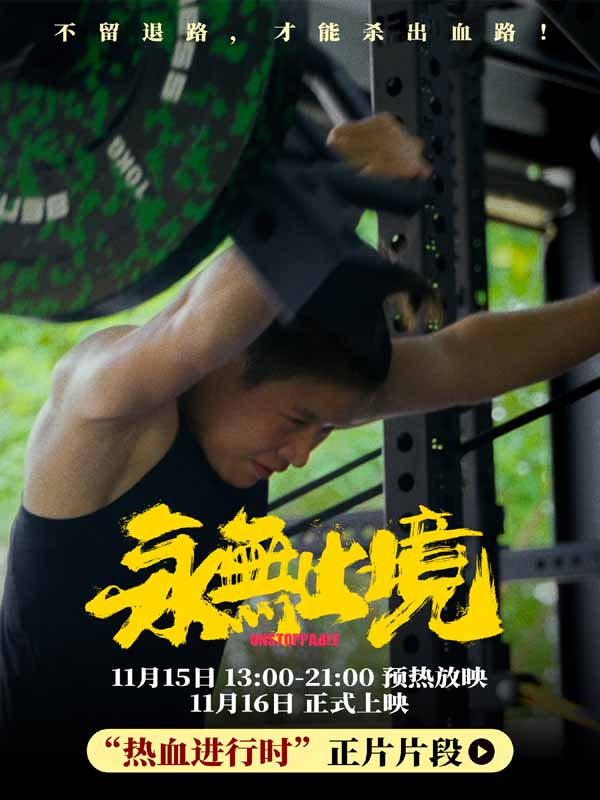 电影《永无止境》将于11月16日全国院线正式上映。影片由深圳千万间影业有限公司、上海尚燃越展体育文化中心、五二三影像文化(广州)有限公司、北京千万间文化传播有限公司、天津猫眼文化传媒有限公司、上海猫眼影业有限公司出品。目前影片预售及预热放映购票通道已全面解锁,诚邀各位观众提前见证张伟丽“永不言弃”的格斗人生!
