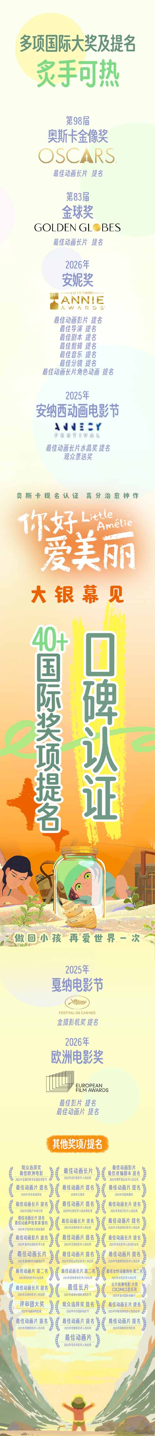 近日,第98届奥斯卡金像奖提名公布,电影《你好,爱美丽》荣获最佳动画长片提名。自去年起,《你好,爱美丽》便在多个国际电影节展中亮相并持续获得关注与肯定,截至目前,影片斩获包含奥斯卡金像奖最佳动画长片提名、金球奖最佳动画长片提名、安妮奖最佳动画影片在内的7项提名、安纳西国际动画电影节最佳动画长片水晶奖提名及观众票选奖等40余项奖项与提名,以非凡的艺术魅力在全球动画影坛中大放异彩,成为颁奖季备受瞩目的动画作品之一。电影在海外好评如潮,烂番茄新鲜度达98%,海外媒体IndieWire评价道:“这是一场独属于孩童的冥思,既歌颂生命馈赠的所有美好,也直面那些让美好更值得珍惜的逝去”。影片也曾在金鸡百花电影节与海南岛国际电影节进行了放映活动,不少观众表示很久没有观看到如此安静、轻盈,专注于情感感知的动画作品,电影独特的孩童视角与对生命最初温柔的回望深深触动了观众内心最柔软的部分。期待电影早日上映,有更多的观众能与爱美丽一起感受美好,重新拥抱世界,找到属于自己的那份感动与力量。