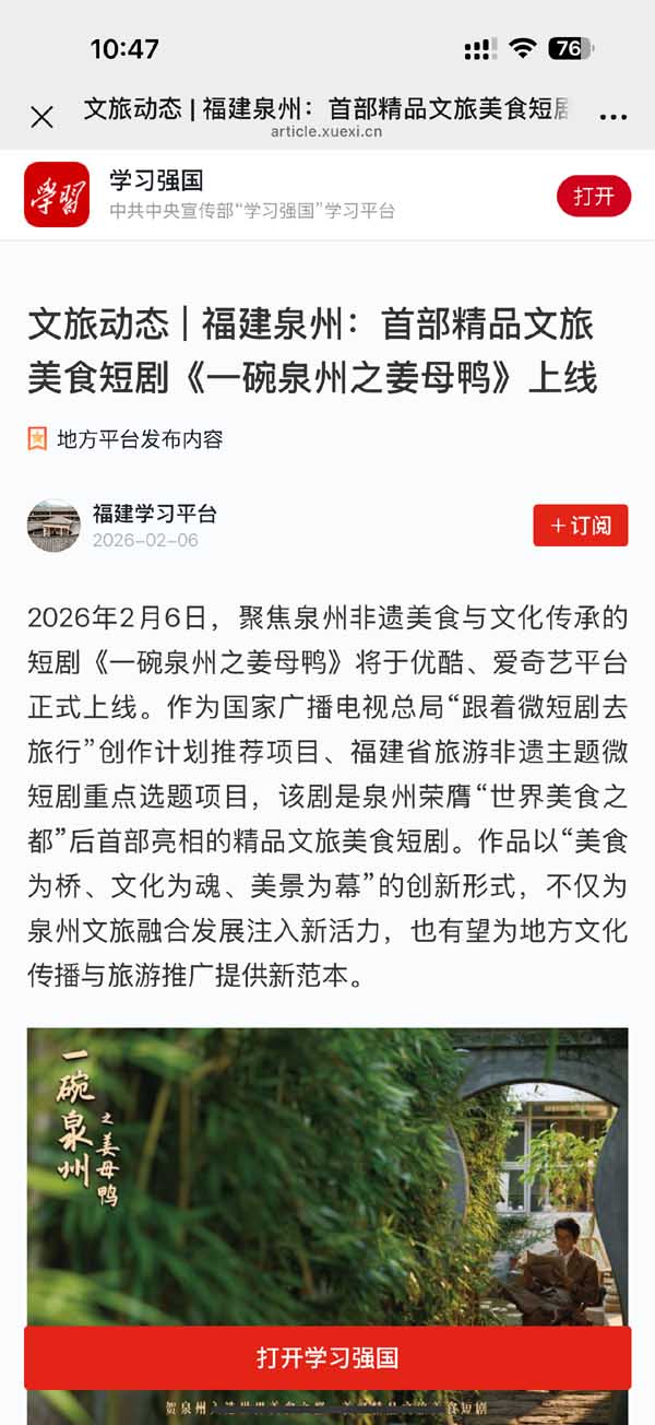 近日,泉州荣膺“世界美食之都”后首部精品文旅美食短剧《一碗泉州之姜母鸭》正式上线。剧集凭借鲜活的本土故事、浓郁的非遗风味和暖心的市井情怀,引发福建及中央各级官方媒体集中关注与报道。中新社、中国网、东南网、福建日报、学习强国、泉州晚报、东南早报等权威媒体和平台纷纷刊发新闻内容,泉州发布、海丝泉州文旅之声等官方新媒体同步推送,形成线上线下联动、传统媒体与新媒体共振的传播热潮。